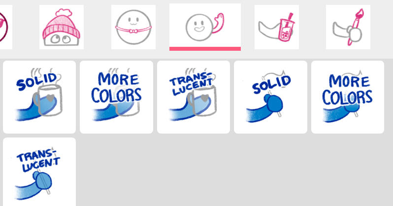 Each category (the upper menu items, in pink) has a set number of color swatches, which I determine in the category/"part" settings. The site only allows a maximum of 18 color swatches per category, so any items that I've made more than 18 color variants for is split into two items. The colors on the second item are not going to match the color swatches. In most cases, these are not evenly split; the number of color swatches may be based on a different item in the category☆, or it may have been an odd number.Thus, this leaves most items in the categories with blank swatches (you can see in the video above how the marble disappears when switching to "more colors" while on the lilac swatch, because there are only 7 variants on this item).There's nothing I can do about this; it's just how the website is built, sorry! I find it annoying too.Please note that this isn't consistent between categories in this maker, because not all categories have the same color variants or number of color variants.☆ For example, the first category, the base colors, is split by 18 because there are 18 translucent color variants and it's easier for me to keep those in one category together. Similarly, the Flowers/Miscellaneous Patterns category has 15 color swatches to accommodate the 15 pool ball numbers.Anyway, if that was too confusing, here's video of the backend to demonstrate how this is set up: