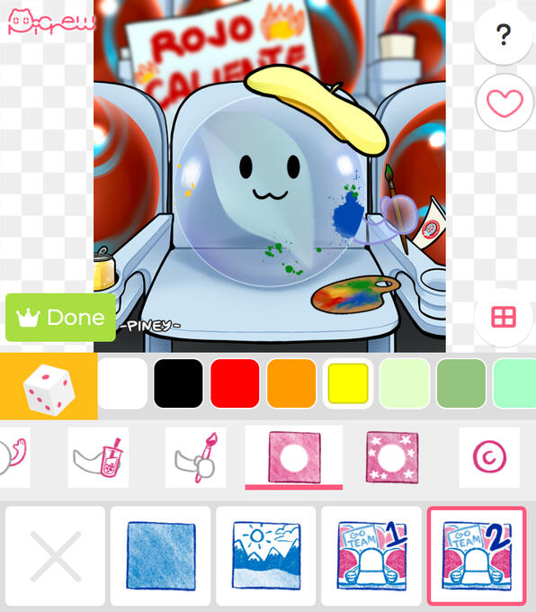 For anyone who is unfamiliar with Picrew, this is a "dress-up" image maker site, where you can generate images based on specific pre-made assets created by artists. Assets are organized into categories (e.g. eyewear, arms, backgrounds) and the items within these categories have their own color variants.Once you click "play," you will see 3 menus, from top to bottom: color swatches, categories (in pink), and category items (in blue here, in most categories). The die icon lets you randomize the image or reset it.